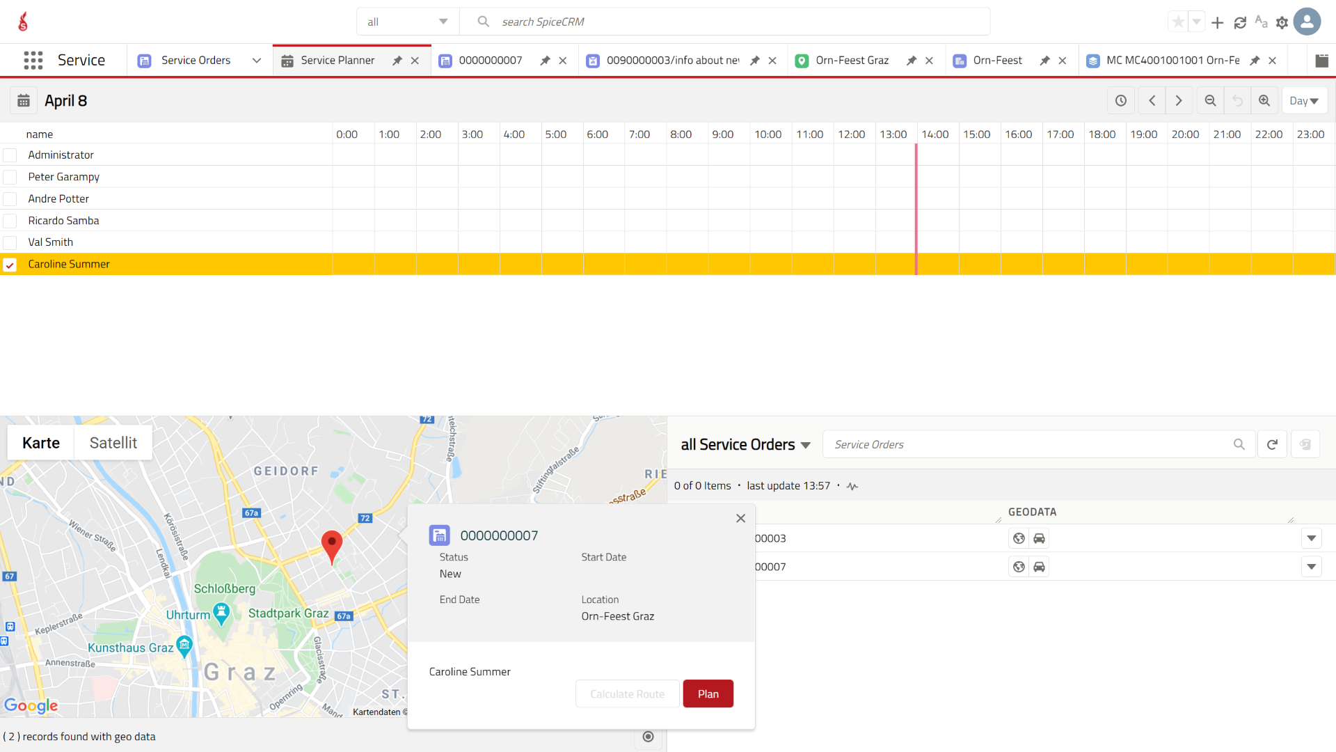 Route planning and an optimal plan for your field force to fulfill the service orders are essential to optimize costs and resources. The Service Planner in SpiceCRM supports you at exactly that task. Get a high-quality overview of service orders with the integrated google map. Get a view of the workload and available timeslots. And best of all the integrated route planning will enable you to also plan travel time properly and allow you to commit realistic dates while optimizing the routes of the field force.